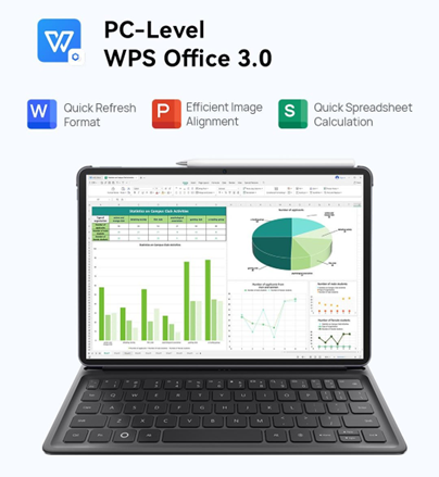 Bagi profesional muda, mengolah dokumen, menyusun presentasi, dan mengelola data adalah rutinitas harian. Tablet ini dibekali PC-Level WPS Office 3.0, memungkinkan pengguna bekerja layaknya menggunakan laptop, mulai dari Docs dengan fitur quick format refresh untuk merapikan dokumen secara instan, PPT dengan efficient image alignment agar presentasi lebih presisi dan profesional, hingga Excel yang mendukung quick spreadsheet calculation, termasuk pengolahan data dan analisis seperti pivot table. Dengan dukungan Cloud Account Support, dokumen pekerjaan dapat tetap tersinkronisasi lintas perangkat.