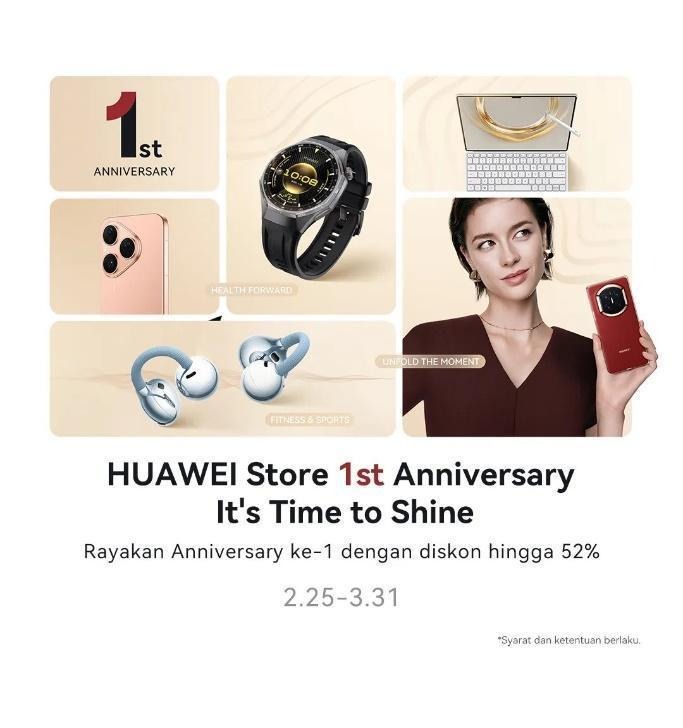 Selama periode ini, konsumen berkesempatan mendapatkan total hadiah hingga Rp13,1 juta, mencakup cashback bank hingga Rp5 juta, free HUAWEI WATCH GT 5 Pro senilai Rp4 juta, trade-in cashback hingga Rp1,5 juta, screen insurance senilai Rp2,6 juta, serta cashback tiket.com senilai Rp300 ribu. Tersedia juga program cicilan 0% hingga 24 bulan mulai dari Rp1,1 jutaan, sesuai syarat dan ketentuan yang berlaku.