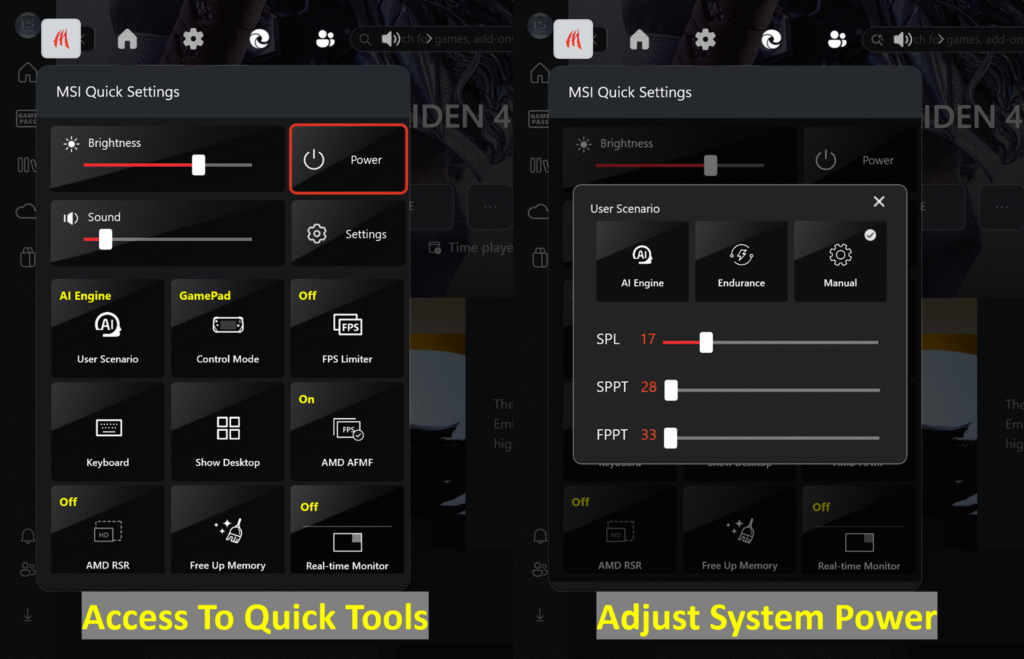 Pengalaman Bermain Game yang Dipersonalisasi: Pengalaman Bermain Game yang Dipersonalisasi: MSI Quick Settings terintegrasi ke dalam Xbox Game Bar, memungkinkan pengguna untuk dengan mudah mengakses berbagai tools dan menyesuaikan pengaturan daya dengan satu klik. Integrasi ini memungkinkan pengguna untuk mempersonalisasi pengalaman bermain game mereka tanpa perlu menavigasi melalui beberapa aplikasi.