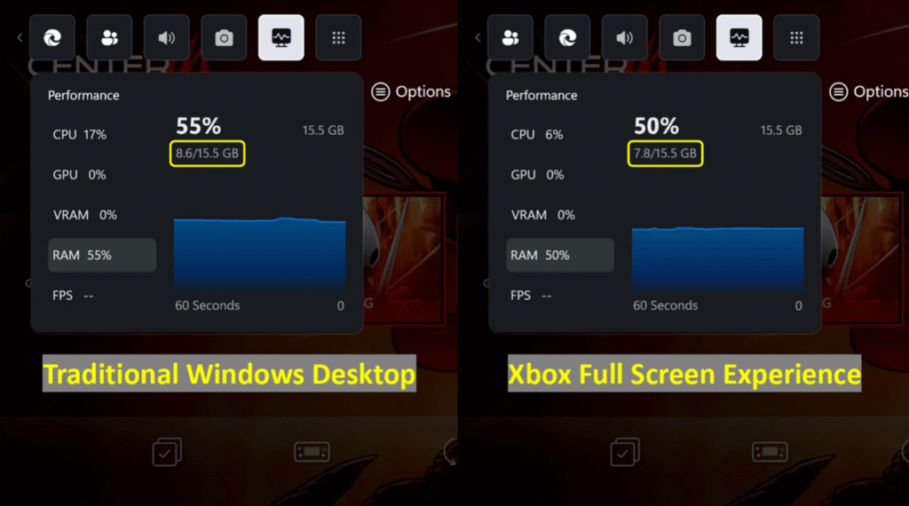 Penggunaan RAM Lebih Rendah: Xbox Full Screen Experience mengonsumsi >5% lebih sedikit RAM dibandingkan dengan desktop Windows tradisional, sehingga membebaskan lebih banyak RAM untuk game, yang menghasilkan gameplay yang lebih lancar dan potensi FPS yang lebih tinggi.